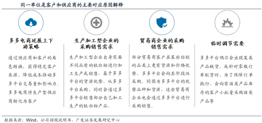 經(jīng)典案例:根據(jù)wind、公司招股說(shuō)明書(shū)、廣發(fā)證券發(fā)展研究中心等綜合資訊表明,國(guó)聯(lián)股份下屬的多多電商公司由于涂料化工行業(yè)、玻璃行業(yè)和衛(wèi)生用品 行業(yè)的工業(yè)配件和原料較多,公司在拓展部分品類的時(shí)候有望鏈接上下游需求,通過(guò)供應(yīng)商和客戶的角色轉(zhuǎn)換,獲得穩(wěn)定客戶來(lái)源,打造“超級(jí)大客戶”——“同一平臺(tái)入駐單位”。