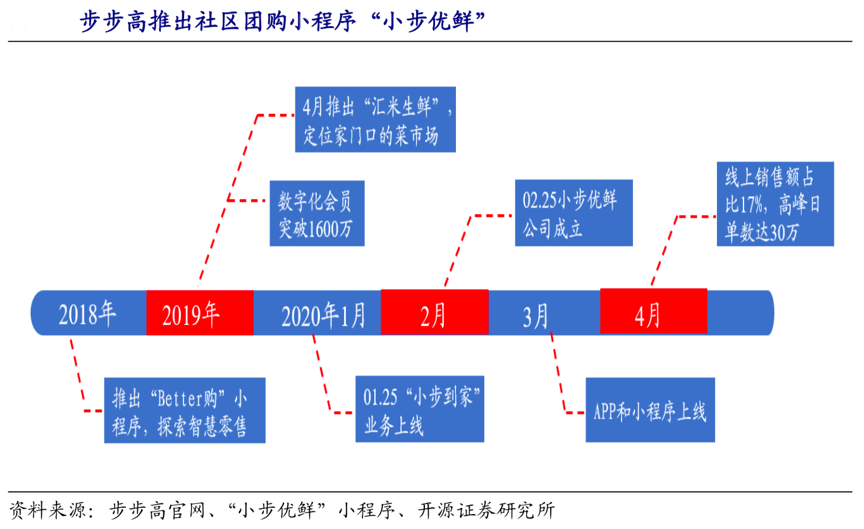 經典案例:根據步步高官網、“小步優(yōu)鮮”小程序、開源證券研究所等綜合資訊表明,2019年,步步高開始數 字化轉型,“以用戶為中心”,加強以生鮮為核心的供應鏈體系。2020 年 1 月 25 日,“小步到家”業(yè) 務正式上線,將智慧零售觸角深入社區(qū)。2 月 25 日,全資子公司——湖南小步優(yōu)鮮 商業(yè)有限公司注冊成立,此后其推出社區(qū)團購 APP 和小程序“小步優(yōu)鮮”,正式入局社區(qū)團 購市場的角逐。