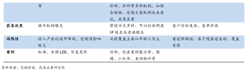 經(jīng)典案例:根據(jù)艾瑞咨詢、民生證券研究院等綜合資訊表明,電商時(shí)代來臨,醫(yī)美機(jī)構(gòu)可通過各大垂直移動(dòng)互聯(lián)網(wǎng)平臺(tái)、自媒體等多渠道營銷。新氧、更美等互聯(lián)網(wǎng)醫(yī)美平臺(tái)的出現(xiàn),一方面將求美者和醫(yī)美機(jī)構(gòu)有效連接,通過 PGC 端打造新媒體矩陣,全面普及醫(yī)美知識(shí),降低了信息不對(duì)稱性;另一方面相對(duì)低廉的營銷費(fèi)用望緩解醫(yī)美服務(wù)行業(yè)高營銷成本的痛點(diǎn)。