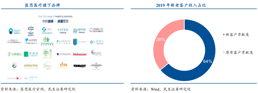 經(jīng)典案例:根據(jù)醫(yī)思醫(yī)療官網(wǎng)、wind、民生證券研究院等綜合資訊表明,2012年醫(yī)思醫(yī)療在朗豪坊設(shè)立首家美容中心旗艦店,并推出皮膚護(hù)理及美容產(chǎn)品系列 PRODERMA LAB,成功打造出知名醫(yī)美品牌 DRREBORN,醫(yī)思醫(yī)療以醫(yī)美為核心定位高質(zhì)量致力于為客戶提供專業(yè)、安全、有效的服務(wù),引進(jìn)高水平的醫(yī)生、對(duì)營業(yè)場(chǎng)所進(jìn)行翻修擴(kuò)建、采用高品質(zhì)醫(yī)療器械醫(yī)提升服務(wù)品質(zhì)。2019年醫(yī)思醫(yī)療原有客戶對(duì)公司收入的貢獻(xiàn)率達(dá)到 64%,反映出了對(duì)其醫(yī)療技術(shù)和服務(wù)質(zhì)量的認(rèn)可。