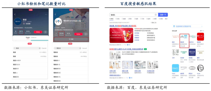 經(jīng)典案例:根據(jù)小紅書(shū)、百度、東吳證券研究所等綜合資訊表明,在種草平臺(tái)小紅書(shū)上,薇姿官方賬號(hào)粉絲 5.8 萬(wàn),相關(guān)筆記 3 萬(wàn)多篇,同比理膚泉粉絲達(dá) 10 萬(wàn),相關(guān)筆記大于 9 萬(wàn)篇。在百度搜索敏感肌、噴霧、藥妝,相關(guān)推薦里理膚泉有50+條。
