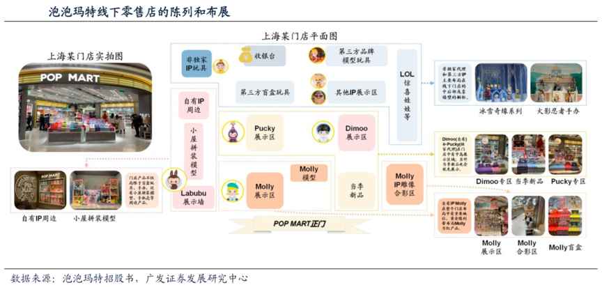 經(jīng)典案例:根據(jù)泡泡瑪特招股書、廣發(fā)證券發(fā)展研究中心等綜合資訊表明,泡泡瑪特線下實(shí)體門店裝修風(fēng)格潮流,環(huán)形設(shè)計(jì)、玩具展示墻和門口的Molly模型的共同烘托出店面的品牌感,合照區(qū)增強(qiáng)了與消費(fèi)者的互動(dòng),快節(jié)奏的背景音樂(lè)動(dòng)感旋律與潮玩文化相得益彰。泡泡瑪特的門店客服訓(xùn)練有素,對(duì)產(chǎn)品理解充分,引導(dǎo)顧客完成消費(fèi)轉(zhuǎn)化。
