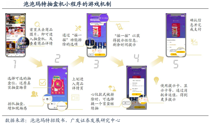 經(jīng)典案例:根據(jù)泡泡瑪特招股書、廣發(fā)證券發(fā)展研究中心等綜合資訊表明,泡泡瑪特2018年9月推出微信抽盒機(jī),將傳統(tǒng)的商品圖示頁(yè)替換成互動(dòng)玩法抽盒機(jī),用戶可直接從微信小程序中進(jìn)入選盒界面,下拉則可以瀏覽商品詳情。虛擬抽盒機(jī)設(shè)置了挑選抽盒位(在一套盲盒中挑選一個(gè))、排隊(duì)(多個(gè)人同抽一套盲盒時(shí)需要排隊(duì))、搖一搖(做初步信息排除) 等以還原真實(shí)抽盒場(chǎng)景,另外,為了增加抽盒游戲性,增加了提示卡(增加一條盲盒 商品提示信息)、顯示卡(直接顯示所抽盲盒)等輔助道具,用戶需要完成日常任務(wù)獲得功能道具或幸運(yùn)值,再通過(guò)幸運(yùn)值兌換相關(guān)卡券。由于抽盒機(jī)游戲道具設(shè)置,以及線上換盒的便利性,更容易引發(fā)用戶為獲得高價(jià)值“隱藏款”的消費(fèi)沖動(dòng),提升復(fù)購(gòu)率。