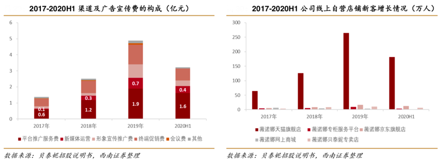 經(jīng)典案例:根據(jù)貝泰妮招股說明書、西南證券等綜合表明,自 2018 年以來,貝泰妮公司通過在微博、微信公眾號、小紅書、抖音、知乎等新興媒體上憑借 KOL 種草、公眾號文章、網(wǎng)絡(luò)直播、短視頻等各類方式進行產(chǎn)品內(nèi)容營銷推廣,多渠道、多層次覆蓋目標消費者群體。2020H1,其新媒體運營費用為 0.4 億元,在營收中占比為9.1%。