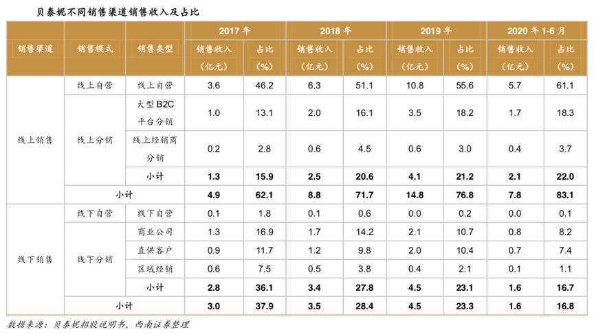 經(jīng)典案例:根據(jù)貝泰妮招股說明書、西南證券等綜合表明,從銷售模式來看,貝泰妮主要通過線下和線上兩種渠道對外銷售。其中其線下銷售主要通過商業(yè)公司、直供客戶以及區(qū)域經(jīng)銷對外銷售,線上銷售主要包括線上直營和大型 B2C 平臺分銷。2017-2019 年,其線上銷售占比從 62.1%上漲至 76.8%。2020H1,其線上銷售 規(guī)模為 7.8 億元,銷售占比為 83.2%。