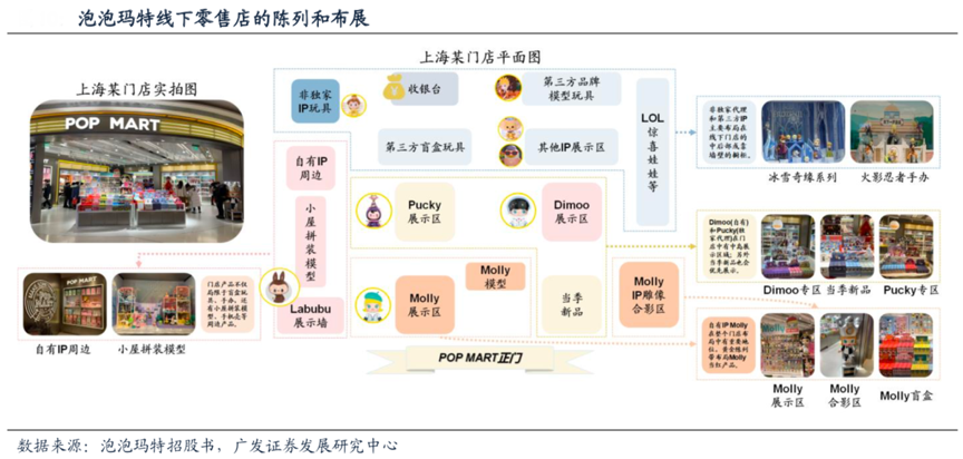 經(jīng)典案例:根據(jù)泡泡瑪特招股書(shū)、廣發(fā)證券發(fā)展研究中心等綜合資訊表明,泡泡瑪特線下實(shí)體門(mén)店裝修風(fēng)格潮流,環(huán)形設(shè)計(jì)、玩具展示墻和門(mén)口的Molly模型的共同烘托出店面的品牌感,合照區(qū)增強(qiáng)了與消費(fèi)者的互動(dòng),快節(jié)奏的背景音樂(lè)動(dòng)感旋律與潮玩文化相得益彰。泡泡瑪特的門(mén)店客服訓(xùn)練有素,對(duì)產(chǎn)品理解充分,引導(dǎo)顧客完成消費(fèi)轉(zhuǎn)化。