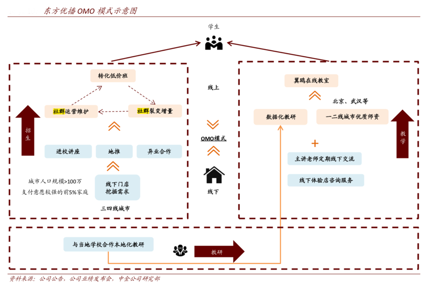 經(jīng)典案例:根據(jù)公司公告、公司業(yè)績(jī)發(fā)布會(huì)及中金公司研究部等綜合資訊表明,從招生引流來(lái)看,東方優(yōu)播融合了線下低成本引流和線上低價(jià)課轉(zhuǎn)化的模式。東方優(yōu)播通過(guò)地推、進(jìn)校講座、異業(yè)合作等線下方式接觸當(dāng)?shù)厣?,進(jìn)行低成本引流,繼而通過(guò)在線低價(jià)課將線下流量導(dǎo)入線上。在線上社群深度運(yùn)營(yíng)中進(jìn)行用戶篩選和維護(hù),提高正課轉(zhuǎn)化率,同時(shí)社群裂變也可以進(jìn)一步擴(kuò)大增量,形成線上招生渠道的自循環(huán)。