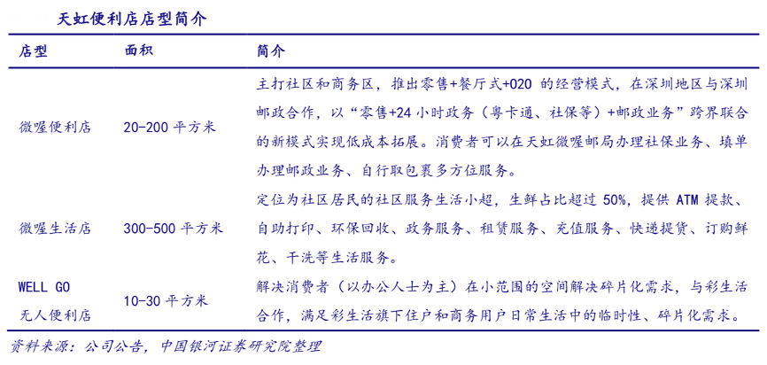 經(jīng)典案例:根據(jù)公司公告、中國銀河證券研究院等綜合資訊表明,天虹便利店以多種店型組合,定位社區(qū)居民、商務(wù)群體等多種消費場景。微喔便利店和微喔生活點定位于社區(qū)生活,無人便利店定位在白領(lǐng)的都市生活。其現(xiàn)有的天虹微喔便利店已形成網(wǎng)格狀布局,在供應(yīng)鏈方面資源共享,降低物流成本,提高配送效率。