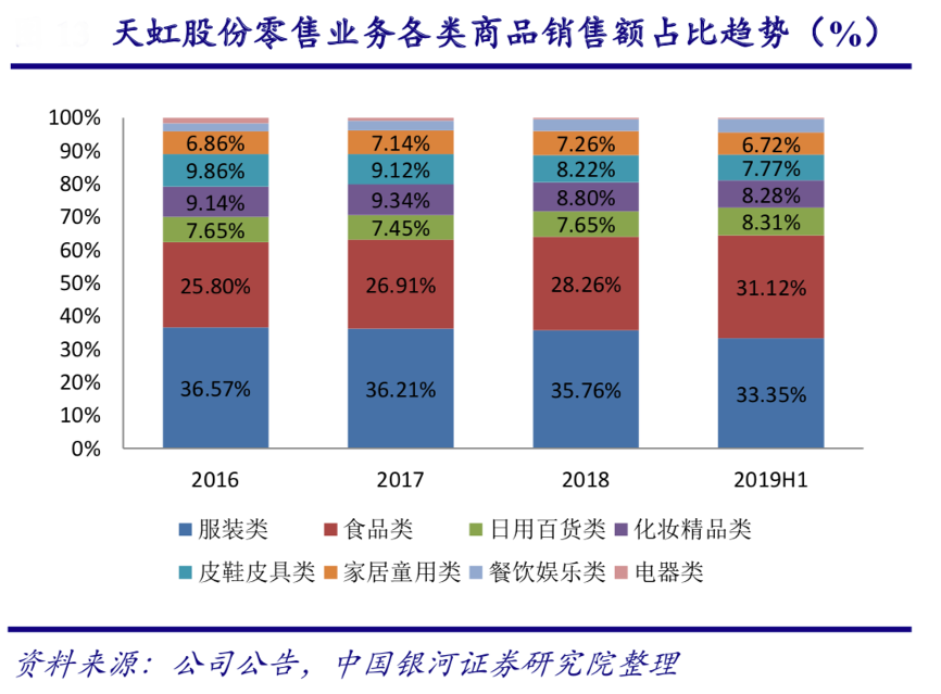 經(jīng)典案例:根據(jù)公司公告、中國銀河證券研究院等綜合資訊表明,從商品品類的銷售額情況來看,截止 2019H1 百貨及購物中心中主要售賣的服裝類、化妝品精品類、皮鞋皮具類、家居童用類、電器商品合計占比天虹股份公司主營零售的比重為 56.54%,較 2016 年縮減 7.54 個百分點;而超市、便利店內(nèi)銷售的食品類、日用品類商品合計占比 39.42%,側(cè)重體驗式的餐飲娛樂營收占比