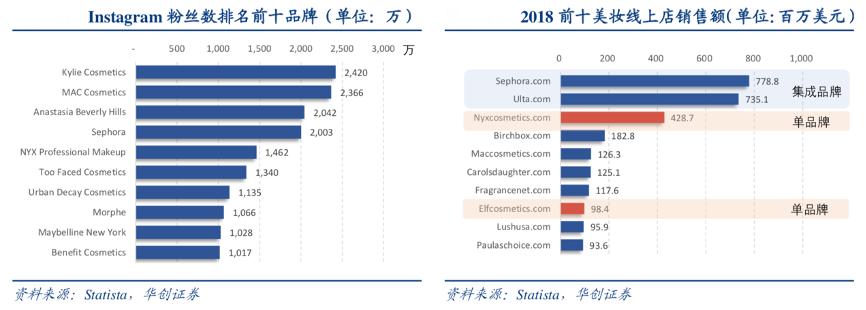 經(jīng)典案例:根據(jù)Statista統(tǒng)計、華創(chuàng)證券等綜合資訊表明,以美國彩妝品牌 E.L.F 為例,成立于 2004 年,成長于社交媒體時代。與大多數(shù)美國 新銳美妝牌子相似,不依賴于傳統(tǒng)的廣告和名人推廣,依賴社交媒體營銷(如TikTok)。 根據(jù) Statista 統(tǒng)計, 除去絲芙蘭、Ulta 兩大品牌集成店,NYX 是 2018 年線上銷售冠軍, E.L.F 同在前十榜單。