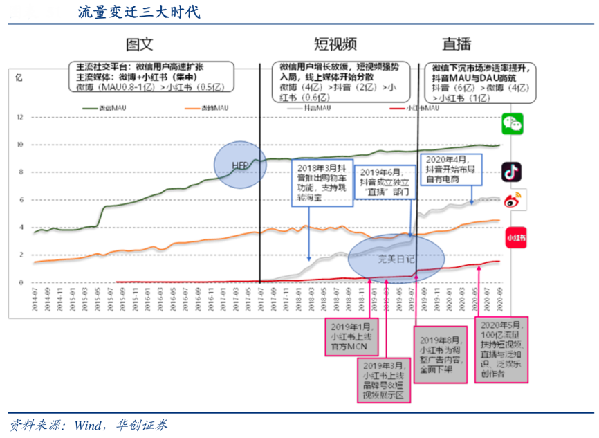 經(jīng)典案例:根據(jù)wind、華創(chuàng)證券等綜合資訊表明,國產(chǎn)彩妝的新媒體營銷變遷經(jīng)歷了三個階段:以小紅書為代表的 1.0 圖文時代,以抖音、快手為代表的 2.0 短視頻時代,以淘寶直播為代表的 3.0 直播時代。流量高地從圖文走向短視頻、直播,更適合彩妝品類進行廣告投放,小紅書等內(nèi)容社區(qū)也形成了彩妝投放 KOL 廣告的重要渠道。圖文重在產(chǎn)品 介紹,短視頻打造產(chǎn)品使用場景和彩妝教程,直播有線上 BA 實時互動、進一步增強購 物體驗,營銷渠道的變遷使得彩妝的消費場景更加完整。