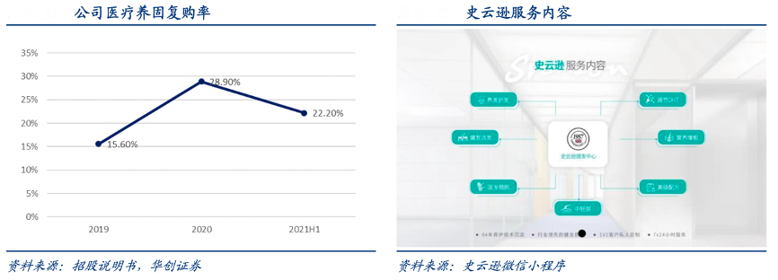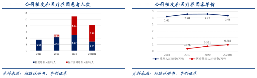 經(jīng)典案例:根據(jù)招股說(shuō)明書(shū)、華創(chuàng)證券等綜合資訊表明,2019年雍禾公司開(kāi)始以史云遜“店中店”模式提供醫(yī)療養(yǎng)固服務(wù),主要為療程方式,即在一段時(shí)間內(nèi)接受多次治療,約 80%為預(yù)付費(fèi)套餐,無(wú)到期日,大部分需在 2 年內(nèi)使用(21H1 預(yù)付套餐患者占比總醫(yī)療養(yǎng)固患者的 81%)。公司醫(yī)療養(yǎng)固服務(wù)提升速度快,2021H1 醫(yī)療養(yǎng)固患者人數(shù)已達(dá) 5.3 萬(wàn)人(2020 全年為 5.9 萬(wàn)人),同 時(shí)客單價(jià)提升,21H1 約 4800 元,2020 年約 3600 元。