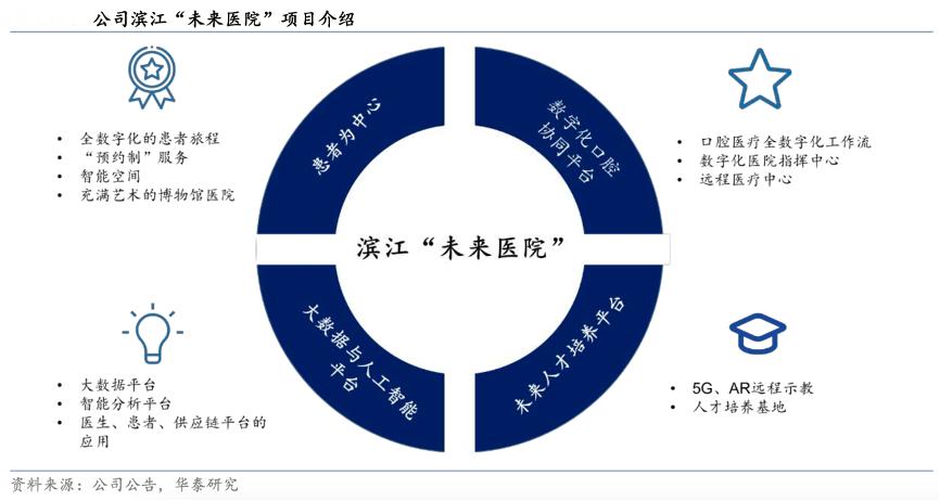 經(jīng)典案例:根據(jù)公司公告、華泰研究等綜合資訊表明,濱江未來醫(yī)院亦為公司完善杭州區(qū)域布局的重點(diǎn)項(xiàng)目,其以未來口腔醫(yī)院為標(biāo)準(zhǔn)進(jìn)行建設(shè),從客戶的預(yù)約、復(fù)診、就診路線等就診的各個(gè)環(huán)節(jié)都將實(shí)現(xiàn)數(shù)字信息化,并借助大數(shù)據(jù)平臺(tái)及人工智能平臺(tái),為醫(yī)院運(yùn)營(yíng)情況及客戶診療結(jié)果提供綜合分析,該院建成后將新增牙椅 43 張。