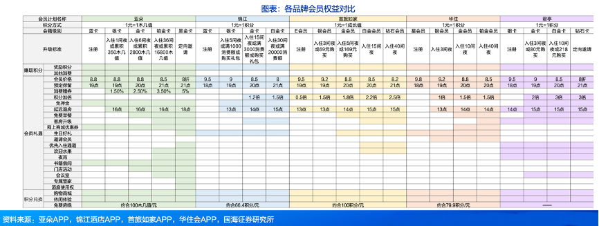 經(jīng)典案例:根據(jù)亞朵APP、錦江酒店APP、首旅如家APP、華住會APP、國海證券研究所等綜合資訊表明,亞朵A-Card會員權(quán)益跳出傳統(tǒng)酒店場景,延伸至出行、閱讀、會議、餐飲以及新零售等多個生活場景,可滿足更多元的消費需求。亞朵的A-Card會員除會員積分、會員價格、預定保留、延遲退房等傳統(tǒng)酒店權(quán)益外,還可以享受多項區(qū)別于其余四家酒店會員的獨特禮遇,如書籍借閱、門店活動、會議室、專屬管家、酒廊使用權(quán)等。