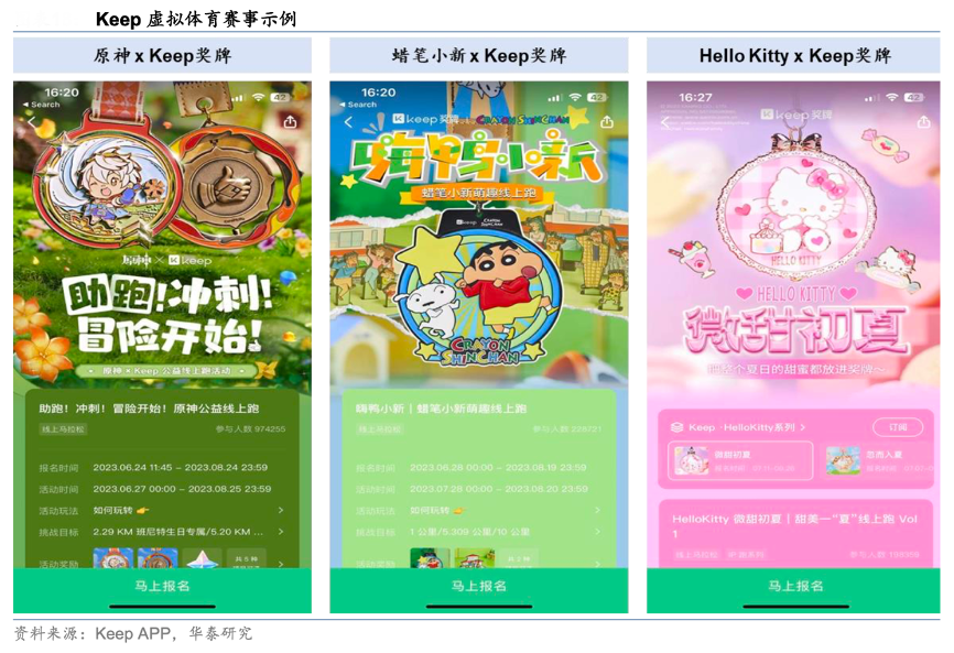 經(jīng)典案例:根據(jù)Keep APP、華泰研究等綜合資訊表明,除標(biāo)準(zhǔn)化健身課程之外,Keep 積極與知名 IP 合作, 推出了虛擬體育賽事等線上付費(fèi)內(nèi)容。Keep 舉辦線上跑等體育賽事,用戶付費(fèi)報(bào)名參加相 關(guān)活動(dòng),在完成所要求的體育鍛煉后即可獲得相應(yīng)的賽事獎(jiǎng)牌。