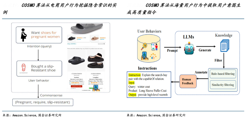經(jīng)典案例:根據(jù)Amazon.Science、國金證券研究所等綜合資訊表明,亞馬遜推薦算法以用戶為導(dǎo)向由 A9 更新到 A10,引入 COSMO 算法,提升銷售轉(zhuǎn)化率。 A10 通過降低付費廣告影響、重視品牌影響力和營銷轉(zhuǎn)化效率,以削弱賣家對流量的把 控。COSMO 算法利用大語言模型,將常識知識融入搜索流程,從產(chǎn)品為中心轉(zhuǎn)向客戶為中心,使搜索結(jié)果與用戶意圖更一致。經(jīng)測試,將 COSMO 整合到約 10%的美國站流量后,產(chǎn)品銷售額增長 0.7%,相當(dāng)于年增 49 億美金銷售額。