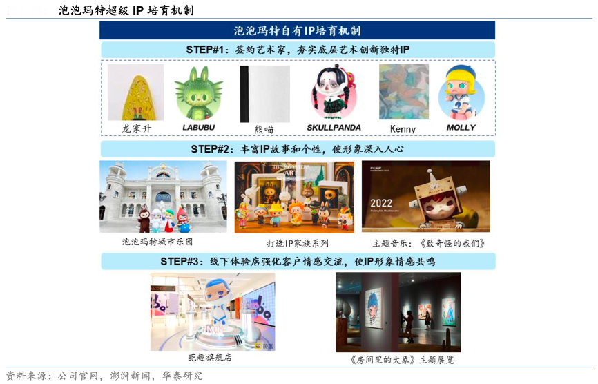 經(jīng)典案例:根據(jù)公司官網(wǎng)、澎湃新聞、華泰研究等綜合資訊表明,泡泡瑪特公司通過簽約知名網(wǎng)絡(luò)藝術(shù)家,夯實藝術(shù) IP 創(chuàng)新 的基礎(chǔ),保證源源不斷的高質(zhì)量 IP 供應(yīng)。同時公司通過推出 IP 家族系列閉環(huán)故事線,打造 IP 人物宇宙吸引消費者,更推出相關(guān)主題音樂、線下城市樂園等活動,使得 IP 形象融入生活深入人心。