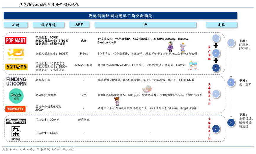經(jīng)典案例:根據(jù)公司公告、華泰研究等綜合資訊表明,國內(nèi)將潮流玩具和盲盒銷售模式相結(jié)合的泡泡瑪特 與名創(chuàng)優(yōu)品,均通過自身努力和不斷創(chuàng)新,實(shí)現(xiàn)了 IP 運(yùn)營、產(chǎn)品設(shè)計(jì)、品牌、渠道和供應(yīng) 鏈全產(chǎn)業(yè)鏈打通,2023 年泡泡瑪特中國內(nèi)地收入同比增 25.7%,名創(chuàng)優(yōu)品也實(shí)現(xiàn)了國內(nèi)線下 GMV 同比 39%的快速增長。