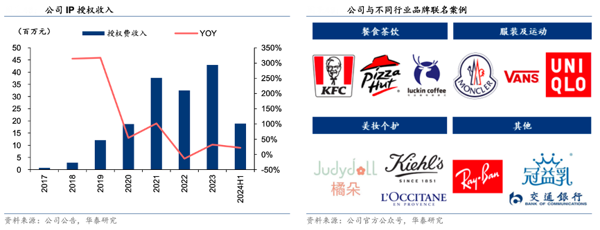 經(jīng)典案例:根據(jù)公司公告、公司官方公眾號(hào)、華泰研究等綜合資訊表明,尋求與泡泡瑪特公 司 IP 聯(lián)名的品牌商快速增加,目前已覆蓋包括餐飲、美妝、服裝、酒店、 食品飲料、運(yùn)動(dòng)鞋服等在內(nèi)的眾多行業(yè),帶動(dòng)公司授權(quán)收入在 23 年達(dá)到 4,301 萬元。與知名消費(fèi)品品牌的 “強(qiáng)強(qiáng)聯(lián)合”能夠助力公司 IP 加速破圈,例如公司已與優(yōu)衣庫三度合作(分別以 Molly、the Monsters、Dimoo 三大 IP),聯(lián)名的 T 恤在全球的優(yōu)衣庫門店銷售。