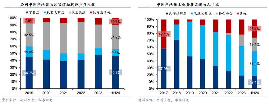 經(jīng)典案例:根據(jù)公司公告、華泰研究等綜合資訊表明,截至 2024H1,泡泡瑪特公司在中國內(nèi)地優(yōu)質(zhì)商圈已開設(shè) 374 家零售店,此外機(jī)器人商店網(wǎng)絡(luò)提供輕資產(chǎn)高效擴(kuò)張渠道,為零售店提供數(shù)據(jù)洞察指引。2022下半年開始,公司把握抖音新渠道快速崛起的機(jī)遇積極布局,以自播為主的模式拓展直播營銷,目前擁有多個(gè)定位不同的直播間(例如其中抖音官方旗艦店中 MEGA 銷售占比高,泡泡家 POPHOME 聚焦家居品類,泡泡瑪特拆盒體驗(yàn)館以盲盒為主)。