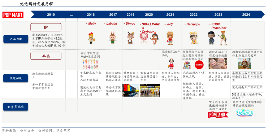 經(jīng)典指標(biāo):根據(jù)公司公告、公司官網(wǎng)、華泰研究等綜合資訊表明,泡泡瑪特公司 2010 年成立,早期定位為文創(chuàng)、玩具的精品零售渠道,并在這一過程中發(fā)現(xiàn)了潮玩盲盒在國(guó)內(nèi)的銷售潛力。2016 年公司轉(zhuǎn)型并聚焦于盲盒品類,發(fā)售首款自主潮玩盲盒系列“Molly 星座”,引領(lǐng)國(guó)內(nèi)盲盒銷售熱潮,此后進(jìn)入持續(xù)的業(yè)績(jī)釋放期。