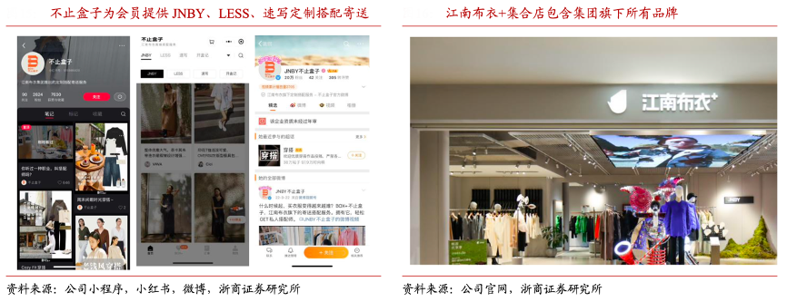 經(jīng)典案例:根據(jù)公司小程序、小紅書、微博、公司官網(wǎng)、浙商證券研究所等綜合資訊表明,在多品牌矩陣的基礎(chǔ)上,江南布衣推出 BOX+不止盒子會(huì)員服務(wù),打破原有單一品牌的割裂狀態(tài),使得消費(fèi)者可以通過(guò)不同品牌搭配嘗試不同的穿搭風(fēng)格,打造專屬自己的時(shí)尚造型。