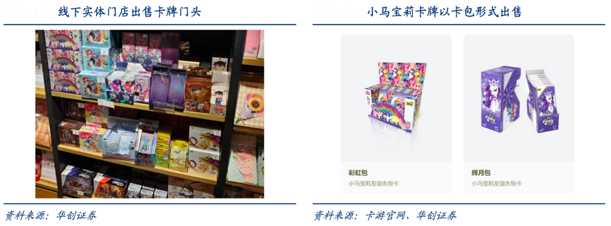 經典案例:根據(jù)卡游官網、華創(chuàng)證券等綜合資訊表明,在大部分集換式卡牌中,卡片通常以卡包的形式出售給消費者,消費者一般購買固定款式的卡包,每包中含有固定數(shù)量的卡片,但其中卡片的種類與內容是隨機的。因此,玩家購買卡牌時可能會抽取到相同的卡面,不同玩家之間可能對不同卡面有不同的需求,從而產生與朋友間集換卡牌的社交需求。