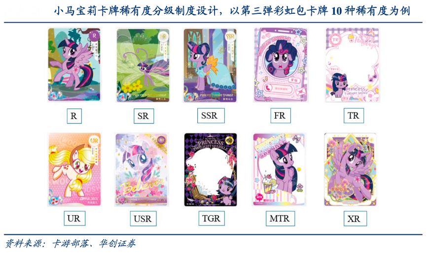 經典案例:根據(jù)卡游部落、華創(chuàng)證券等綜合資訊表明,以小馬寶莉卡牌·友誼永恒卡第 3 彈彩虹盒為例,有 10 種稀有度等級的卡,分別是 R、 SR、SSR、FR、TR、MTR、TGR、UR、USR 和 XR,一個彩虹盒包括 20 包,每包有五 張卡,共 100 張卡??ò梢詣澐譃橄∮邪?1XR/USR/UR/SSR+1TGR/TR/MTR+3FR/SR/R) 和普通包(1SR+1TGR/TR+3FR/R),根據(jù)卡游官方天貓店信息,在所有已生產的卡包中, 稀有包的出現(xiàn)概率為 10:20。不同等級的卡片抽中的概率不同,等級越高的卡牌往往抽中 的概率越低。