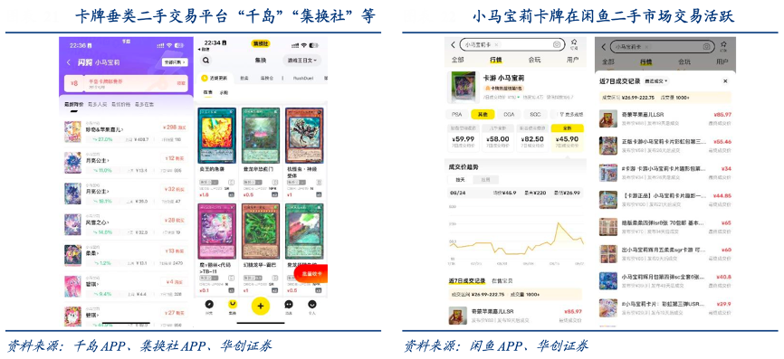 經(jīng)典案例:根據(jù)千島APP、集換社APP、閑魚APP、華創(chuàng)證券等綜合資訊表明,伴隨卡牌玩家的增長(zhǎng),二手流通市場(chǎng)逐漸成熟,玩家不僅可以在“閑魚”等通用二手交易平臺(tái),也可以在垂類卡牌二手交易平臺(tái)如“千島”“集換社”等平臺(tái)交易卡牌。以小馬寶莉卡牌為例,閑魚平臺(tái)二手流通交易活躍,平臺(tái)行情模塊顯示近期成交價(jià)在 40-200 元不等。