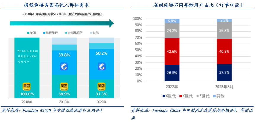 經(jīng)典案例:根據(jù)Fastdata《2020年中國在線旅游行業(yè)報告》、華創(chuàng)證券等綜合資訊表明,結(jié)合月狐 iAPP 數(shù)據(jù),2023 年 6 月攜程 app 的新增用戶中,三成以上用戶為 25 歲及以下。且 伴隨消費者年齡和收入增加,攜程能承接該部分人群的進階需求,呈現(xiàn)出用戶從其他 OTA平臺遷移至攜程的特征,側(cè)面反映攜程產(chǎn)品定位相對高端和用戶需求匹配。