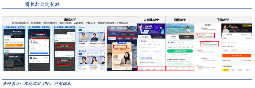 經(jīng)典案例:根據(jù)在線旅游APP、華創(chuàng)證券等綜合資訊表明,度假業(yè)務(wù)上,2023 年攜程私家團 GMV 同比 2019 年增長 370%,其中 2~9 人的小團 GMV 同比 2019 年增長 100%,國內(nèi)私家團的占比提升了 4 倍(當年底占比已提升到 10%), 海外則提升了 1 倍。相比較下,攜程定制游產(chǎn)品相較其他平臺更為個性化和人性化,依 托完整的大交通和大住宿的旅游生態(tài)圈,定制產(chǎn)品有更為明顯的優(yōu)勢。