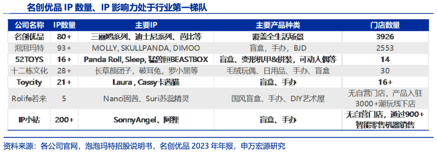 經(jīng)典案例:根據(jù)各公司官網(wǎng)、泡泡瑪特招股說明書、名創(chuàng)優(yōu)品2023年年報(bào)、申萬宏源研究等綜合資訊表明,與國(guó)內(nèi)其他潮玩產(chǎn)業(yè)玩家相比,名創(chuàng)優(yōu)品在 IP 數(shù)量及 IP 知名度方面具有較大優(yōu)勢(shì)。據(jù)公司官網(wǎng),截至目前,名創(chuàng)優(yōu)品已與超 80 個(gè)國(guó)內(nèi)外知名 IP 進(jìn)行深度合作,同時(shí)名創(chuàng)優(yōu)品線下門店規(guī)模優(yōu)勢(shì) 顯著,截至 2023 年底國(guó)內(nèi)線下門店數(shù)達(dá) 3926 家。
