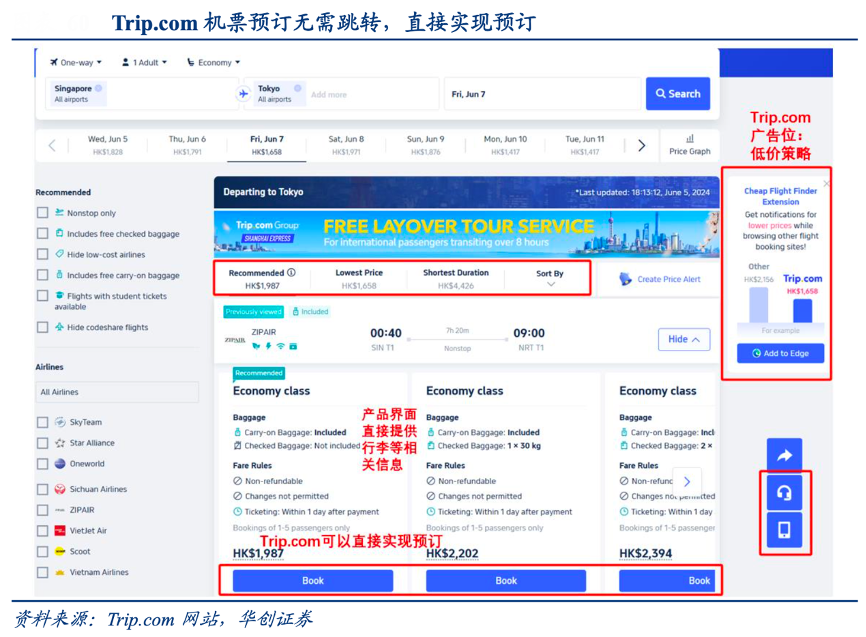 經(jīng)典案例:根據(jù)Trip.com網(wǎng)站、華創(chuàng)證券等綜合資訊表明,產(chǎn)品定位上,機票屬于 Trip.com 的 引流產(chǎn)品,按照出行習(xí)慣,機票預(yù)訂早于酒店預(yù)訂,Trip.com 在搜索引擎導(dǎo)流后的跳轉(zhuǎn) 頁面為機票預(yù)訂頁面;同時,基于機票的流量,Trip.com 通過交叉銷售可以實現(xiàn)酒店、旅游 服務(wù)的協(xié)同。