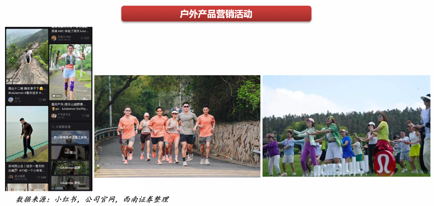 經(jīng)典案例:根據(jù)小紅書、公司官網(wǎng)、西南證券等綜合資訊表明,Lululemon在各大城市積極開展線下戶外興趣活動 ,如春日跑、露營、燈傘等集群活動,在忠實消費者嘗試多品類產(chǎn)品的同事擴大圈層,吸引其他細分賽道消費者。