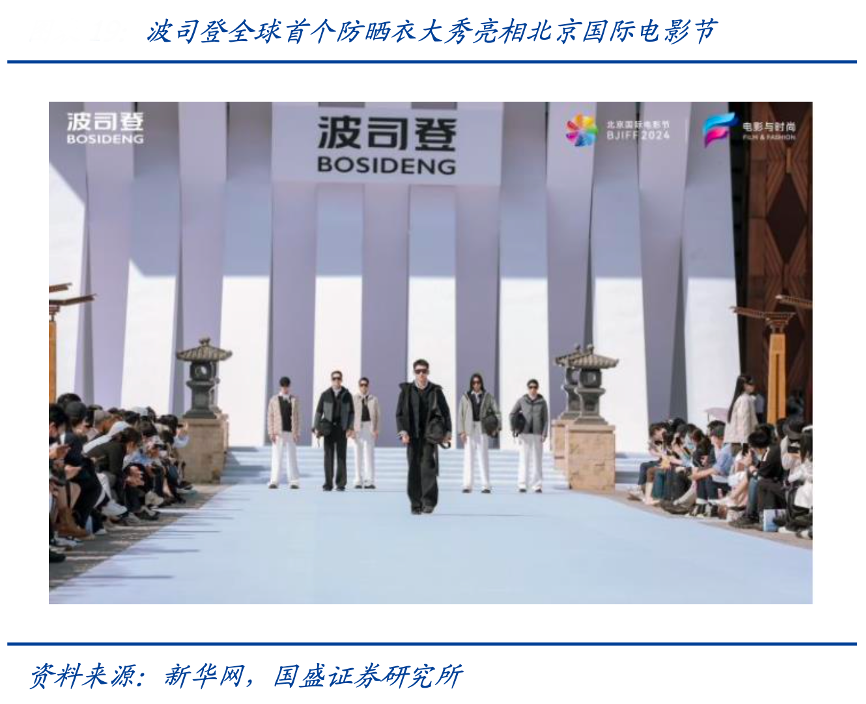 經(jīng)典案例:根據(jù)新華網(wǎng)、國盛證券研究所等綜合資訊表明,波司登品牌在中國消費(fèi)市場(chǎng)沉淀多年,品牌影響力強(qiáng),粉絲基數(shù)大,推出新品類效果相對(duì)較好。2024 年 4 月公司舉辦全球首場(chǎng)防曬衣專場(chǎng)發(fā)布會(huì),發(fā)布 2024 年春夏新款防曬產(chǎn)品,搶占年輕消費(fèi)者心智,助力品牌年輕化。