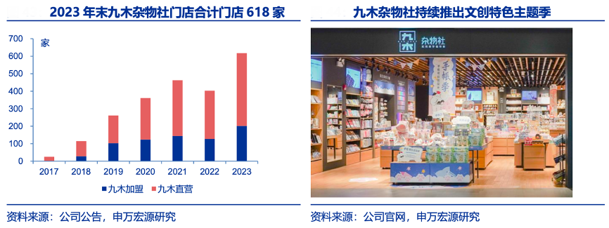 經(jīng)典案例:根據(jù)公司公告、公司官網(wǎng)、申萬(wàn)宏源研究等綜合資訊表明,九木雜物社是以 15-29 歲的品質(zhì)女生作為目標(biāo)消費(fèi)群體,銷售的產(chǎn)品主要為文具文創(chuàng)、益智文娛、實(shí)用家居等品類,店鋪主要分布在各城市核心商圈的優(yōu)質(zhì)購(gòu) 物中心。早期九木雜物社直營(yíng)模式積累運(yùn)營(yíng)經(jīng)驗(yàn),2018 年 7 月開(kāi)啟加盟模式,2023 年末 九木雜物社門店 618 家。