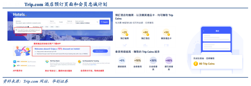 經(jīng)典案例:根據(jù)Trip.com網(wǎng)站、華創(chuàng)證券等綜合資訊表明,Trip.com價(jià)格上提供最惠保障,提供積分獎勵用以加強(qiáng)用戶粘性。同時(shí)平臺為加強(qiáng) 用戶粘性和讓利消費(fèi)者,除享有對應(yīng)會員等級的折扣外,另提供積分抵扣訂單金額計(jì)劃, 100 trip coin=1USD,會員等級越高獲取積分比例越高。