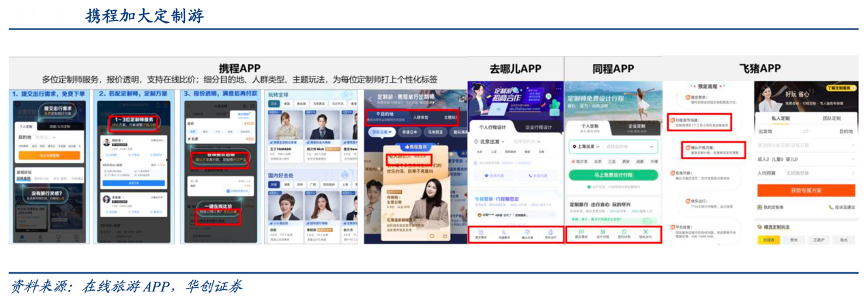 經(jīng)典案例:根據(jù)在線旅游APP、華創(chuàng)證券等綜合資訊表明,2023年攜程私家團(tuán) GMV 同比 2019 年增長 370%,其中 2-9 人的小團(tuán) GMV 同比 2019 年增長 100%,國內(nèi)私家團(tuán)的占比提升了 4 倍(當(dāng)年底占比已提升到 10%), 海外則提升了 1 倍。相比較下,攜程定制游產(chǎn)品相較其他平臺更為個性化和人性化,依 托完整的大交通和大住宿的旅游生態(tài)圈,定制產(chǎn)品有更為明顯的優(yōu)勢。