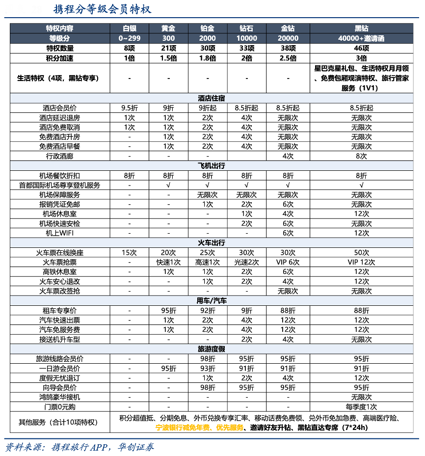 經(jīng)典案例:根據(jù)攜程旅行APP、華創(chuàng)證券等綜合資訊表明,攜程目前擁有超 4 億會(huì)員,每年投入數(shù)十 億擴(kuò)展會(huì)員服務(wù),構(gòu)建起目前“白銀、黃金、 鉑金、鉆石、金鉆、黑鉆”的會(huì)員體系。2020 年攜程普通會(huì)員年均訂單 5 個(gè),年均消費(fèi)超 1000 元;鉆石、黑鉆用戶年均訂單分別 50+、100+,年均消費(fèi)分別超 10 萬(wàn)、40 萬(wàn)。