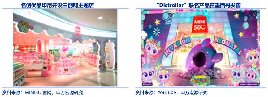 經(jīng)典案例:根據(jù)MINISO官網(wǎng)、YouTube、申萬宏源研究等綜合資訊表明,在運(yùn)用全球熱門 IP 同時(shí),名創(chuàng)優(yōu)品注重特色 IP 在具體市場(chǎng)的本土化呈現(xiàn)。如在印尼開設(shè)三麗鷗 IP 限定主題店,以 Hello Kitty、酷洛米、玉桂狗等角色營(yíng)造夢(mèng)幻童趣氛 圍,深受當(dāng)?shù)啬贻p消費(fèi)者喜愛在墨西哥,名創(chuàng)優(yōu)品則根據(jù)當(dāng)?shù)厝藢?duì)“Distroller”的偏好, 專門定制相關(guān)系列產(chǎn)品,進(jìn)一步融入本土市場(chǎng)。