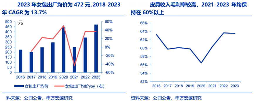 經(jīng)典案例:根據(jù)公司公告、申萬宏源研究等綜合資訊表明,菲安妮積極推新, 2022 年將國潮設(shè)計(jì)融入包袋產(chǎn)品,深耕“巧錦開物”系列,利用獨(dú)家創(chuàng)新織錦工藝推出“煙粉瑤池”“蒼月瑤池”“菱標(biāo)”等新品。通過新品系列,推進(jìn)品牌煥新升級(jí)、有效提升客單價(jià)。2023年女包出廠均價(jià)為 472 元,同比提升 37.3%,2018-2023 年 CAGR 為 13.7%。