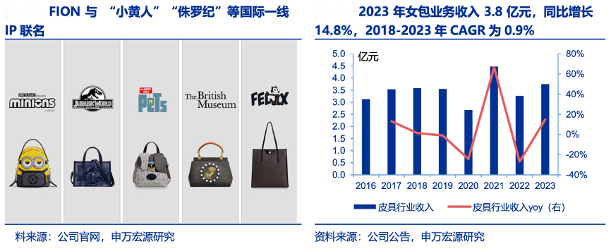 經(jīng)典案例:根據(jù)公司官網(wǎng)、公司公告、申萬宏源研究等綜合資訊表明,F(xiàn)ION 菲安妮 1979 年成立于香港,2014年潮宏基對(duì)菲安妮完成全資收購, FION 強(qiáng)化年輕時(shí)尚、藝 術(shù)生活化的品牌理念,開始與全球不同領(lǐng)域藝術(shù)家合作,與“小黃人”“侏羅紀(jì)”“阿凡 達(dá)“等國際一線 IP 聯(lián)名,并孵化自主 IP“小怪獸”系列。2023年女包業(yè)務(wù)收入 3.8 億元, 同比增長 14.8%,2018-2023 年 CAGR 為 0.9%。