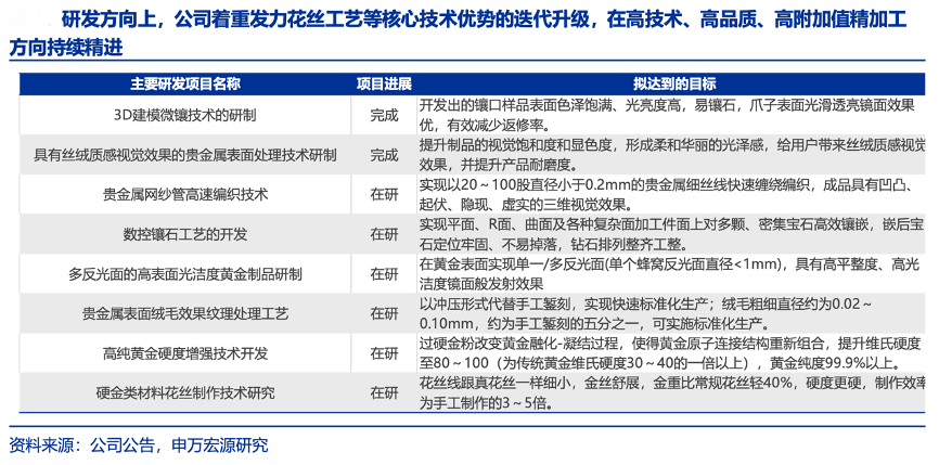 經(jīng)典案例:根據(jù)公司公告、申萬宏源研究等綜合資訊表明,2023年潮宏基公司研發(fā)費用為 0.63 億元,研發(fā)方向上,公司著重發(fā)力花絲工藝等核心技術(shù)優(yōu)勢的迭代升級,在高技術(shù)、高品質(zhì)、高附加值精加工方向持續(xù)精進,保持產(chǎn)品和工藝的獨特性,構(gòu)建差異化的競爭力。