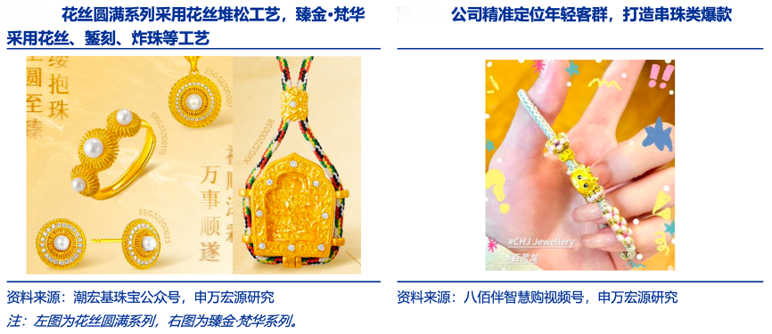經(jīng)典案例:根據(jù)潮宏基珠寶公眾號、八佰伴智慧購視頻號、申萬宏源研究等綜合資訊表明,伴隨著黃金工藝的進步,創(chuàng)意能夠通過古法金、硬金實現(xiàn),潮宏基公司所積累的設(shè)計研發(fā)能力進一步賦能純金產(chǎn)品,例如 2024 年新品花絲圓滿系列采用花絲堆松工藝、臻金·梵華采用花絲、鏨刻、炸珠等工藝。另外,公司精準定位年輕客群,打造串珠類爆款,并通過小紅書等社交平臺的種草傳播成為網(wǎng)紅產(chǎn)品。