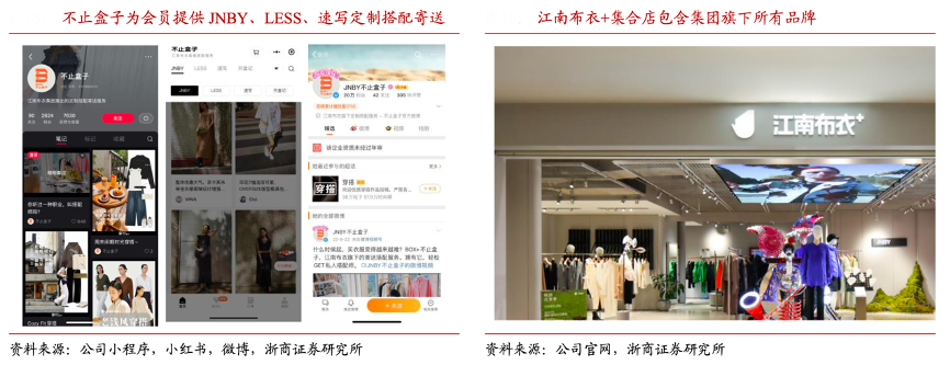 經(jīng)典案例:根據(jù)公司公告、浙商證券研究所等綜合資訊表明,江南布衣公司推出江南布衣+多品牌集合店等新興消費場景和產(chǎn)品,通過“不止盒子私人搭配”、“跨品牌會員權益”、“免運費寄送”、“服裝高端洗護”等會員專屬體驗的消費場景,加強粉絲粘性。FY2023H2、FY2024H1 江南布衣+集合店收入同比分別+119%、+85%至 1.05、1.38 億元,彰顯集團品牌連帶力與新渠道的快速增長。