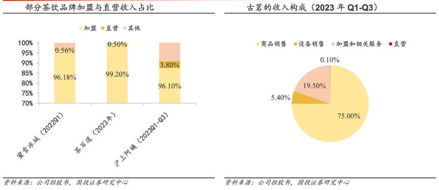 經(jīng)典案例:根據(jù)公司招股書、國投證券研究中心等綜合資訊表明,從加盟和直營收入角度,我們可以看到蜜雪冰城、茶百道和滬上阿姨的加盟收入占比均已超過了96%,加盟收入在主營業(yè)務(wù)收入中占據(jù)絕對主導(dǎo)地位。加盟模式下絕大部分收入來自于向加盟門店銷售商品及設(shè)備,古茗 2023 年前三個(gè)季度中商品和設(shè)備銷售以及加盟和相關(guān)服務(wù)的收入占比達(dá)到了 99.9%。