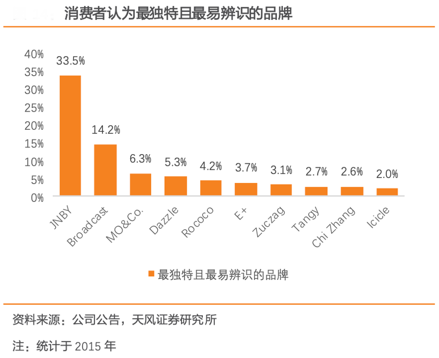 經(jīng)典案例:根據(jù)公司公告、天風(fēng)證券研究所等綜合資訊表明,結(jié)合灼識(shí)咨詢,JNBY在中國(guó)被視為最獨(dú)特且最易識(shí)別的女士服裝設(shè)計(jì) 師品牌,品 牌認(rèn) 知度排 名第一;按重復(fù) 購(gòu)買客 戶數(shù)計(jì) ,在中 國(guó)十大 女士服 裝設(shè)計(jì) 師品牌 中 享有最高 品牌忠 誠(chéng)度。