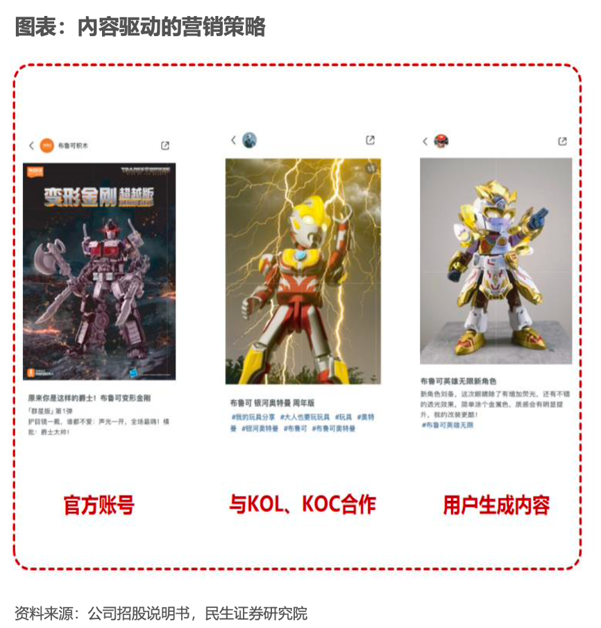 經(jīng)典案例:根據(jù)公司招股說明書、民生證券研究院等綜合資訊表明,布魯可采用內(nèi)容驅(qū)動的獨特互聯(lián)網(wǎng)營銷策略,消費者參與度高。玩具愛好者積極創(chuàng)作并分享視頻和帖子,這些內(nèi)容在社交媒體平臺上獲得了數(shù)以百萬計的播放量。在2023及2024年內(nèi)與布魯可合作的KOL 和KOC在2024年3月31日擁有全網(wǎng)粉絲數(shù)約1.60億。