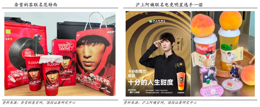 經(jīng)典案例:根據(jù)奈雪的茶官網(wǎng)、滬上阿姨官網(wǎng)、國(guó)投證券研究中心等綜合資訊表明,上新即曝光,緊跟熱潮,新茶飲打響注意力爭(zhēng)奪戰(zhàn)。2023 年 9 月,在周杰倫《范特西》專(zhuān)輯 發(fā)行 22 周年之際,奈雪的茶聯(lián)名薄盒上線范特西音樂(lè)宇宙系列聯(lián)名產(chǎn)品,同時(shí)還推出了 CD 造型的杯墊、印有周杰倫專(zhuān)輯封面的不銹鋼杯子和手提袋,引發(fā)了一波打卡熱潮。在 2023 年 亞運(yùn)會(huì)開(kāi)幕前夕,滬上阿姨就邀請(qǐng)了一諾擔(dān)任鮮果茶體驗(yàn)官,消息已經(jīng)發(fā)出一度刷屏了電競(jìng)愛(ài)好者的社交媒體。