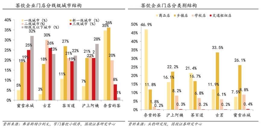 經(jīng)典案例:根據(jù)弗若斯特沙利文、窄門餐飲小程序、頭豹研究院、國投證券研究中心等綜合資訊表明,從門店城市分布結(jié)構(gòu)看,奈雪的茶主要門店集中在一線、新一線城市,對應(yīng)其高端品牌定位;而古茗和蜜雪冰城則相對集中在三線,四線及以下城市,對應(yīng)其低線級向高線級城市的發(fā)展戰(zhàn)略。從門店區(qū)域分布結(jié)構(gòu)看,奈雪的茶主要門店集中在商圈,而古茗和蜜雪冰城則相對集中在鄉(xiāng)鎮(zhèn)店。